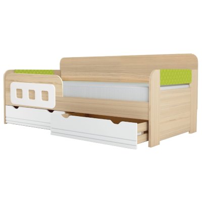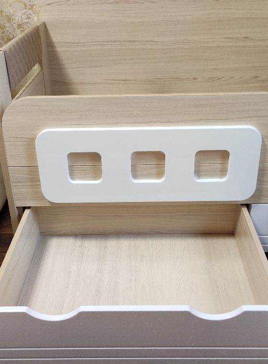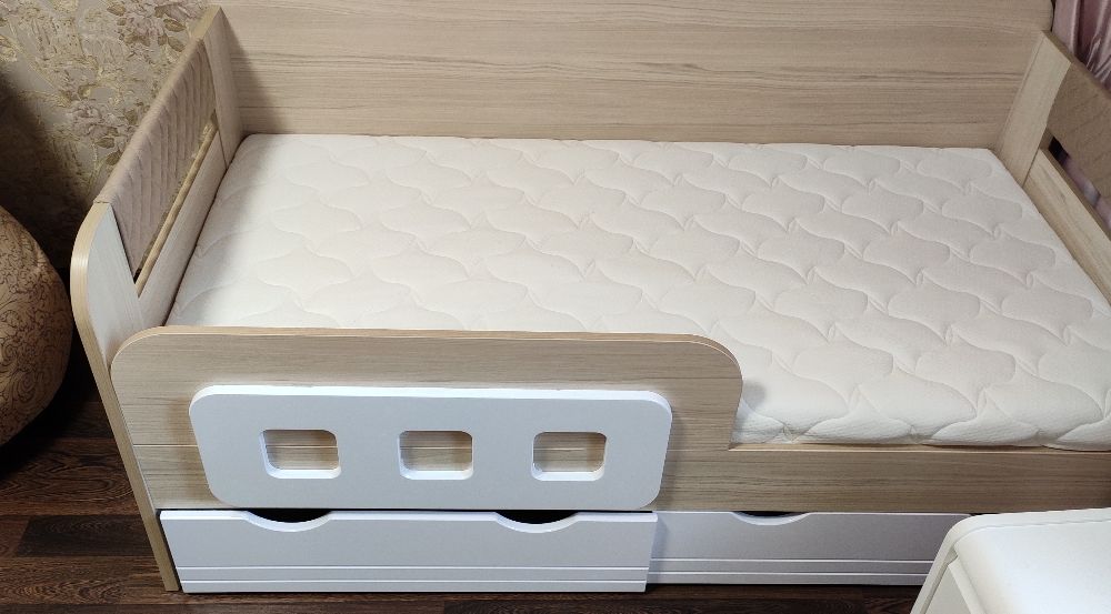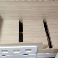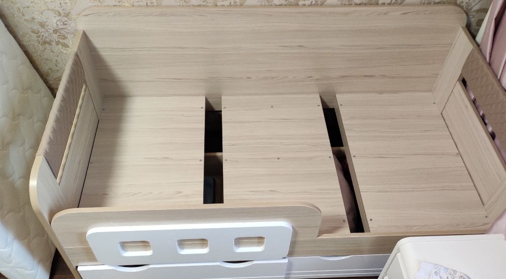 кровать понравилась, очень устойчивая, при перемещении (чтобы убраться за кроватью) двигается легко (у нас паркет) на маленьких пластиковых опорах. подлокотики тоненькие на замке. ящики по размеру не вовсю ширину кровати, но вместительные. единственный минус это то, что ящики идут внахлёст друг другу. размер матраса 80*160*12 очень хорошо подошёл