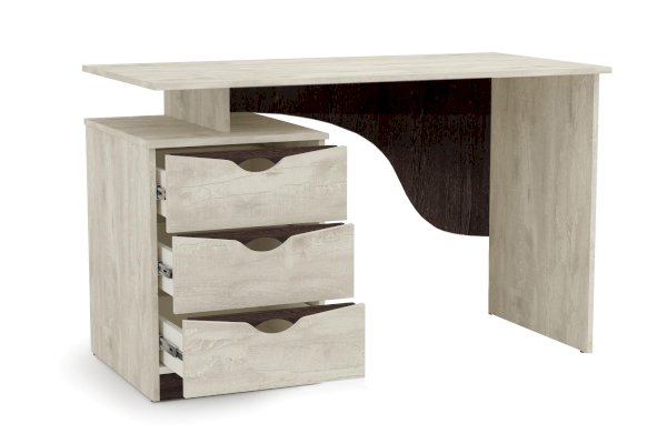 Письменный стол с просторной столешницей пригодится тому, кто учится или работает дома. Интересное дизайнерское решение – тумба находится не вплотную под столешницей, а соединена с ней с помощью вставки из ЛДСП по центру. Таким образом появляются две дополнительные открытые ниши над тумбой, в которые хозяин может положить то, что должно быть всегда под рукой. Это и красиво (так как добавляет воздух и легкость изделию), и удобно одновременно (положить можно с разных сторон и ничего не ограничивает движений).