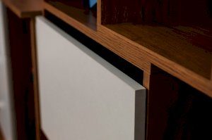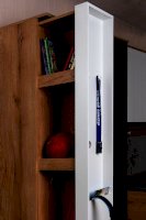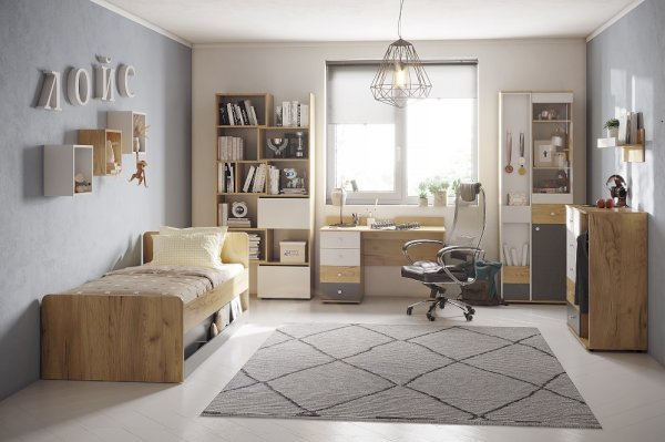 Подростковая кровать-тахта с большим выкатным ящиком на роликах, который можно использовать как место для хранения или как дополнительное спальное место. Он открывается за ручку-карман. Такой импровизированный карман дает возможность аккуратно сложить необходимые перед сном вещи: книгу, телефон, любимую игрушку.