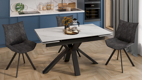 «Дерби» Тип 1 – стильный обеденный стол с керамогранитом, который преобразит любое помещение своим сдержанным видом, строгие и четкие линии подчеркивают элегантный стиль модели. Великолепный образ столу придает строгая по геометрии икс-образная опора, она выделяется своей уникальностью и придает оригинальный вид изделию.