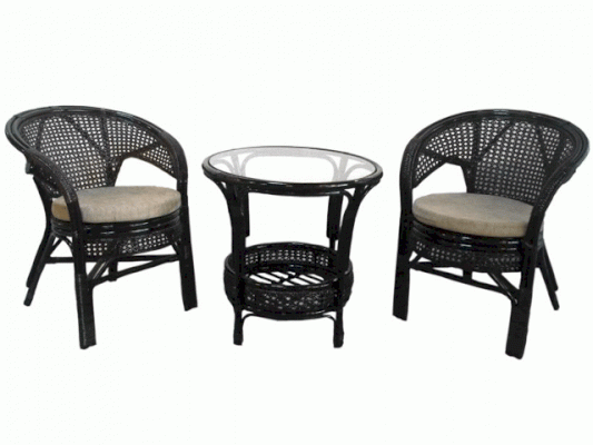 Комплект мебели Пеланги 02/15 включает в себя: 2 кресла и столик с красивым плетением снизу и полочкой, съемные подушки из материала улучшенного качества.