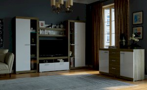 В гостиной Соната применяются современные европейские декоры: корпус выполнен из ЛДСП Дуб сонома, фасад из ЛДСП Белый глянец. Декоры отличаются выраженной тёплой древесной текстурой, а фасадная часть подчёркнута горизонтальными линиями текстуры и стильными планками МДФ, представляющими собой элементы корпуса и фасада.